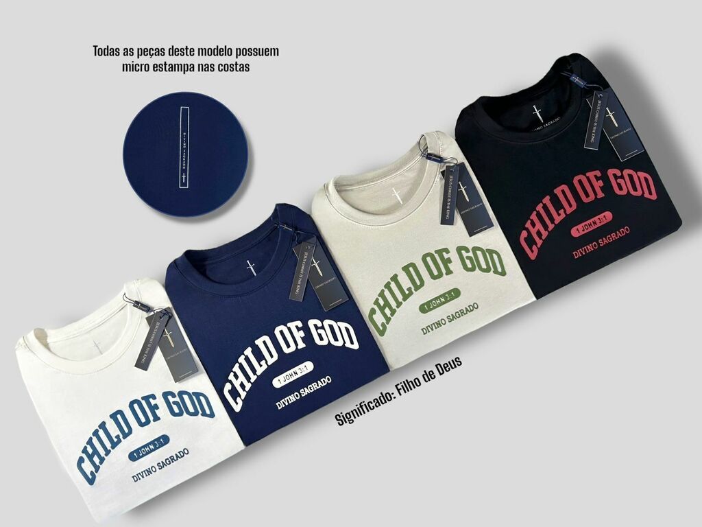 Com uma estampa atemporal e uma pegada college americana, a camiseta CHILD OF GOD une estilo urbano com essência cristã, traduzindo sua fé de forma moderna e elegante.